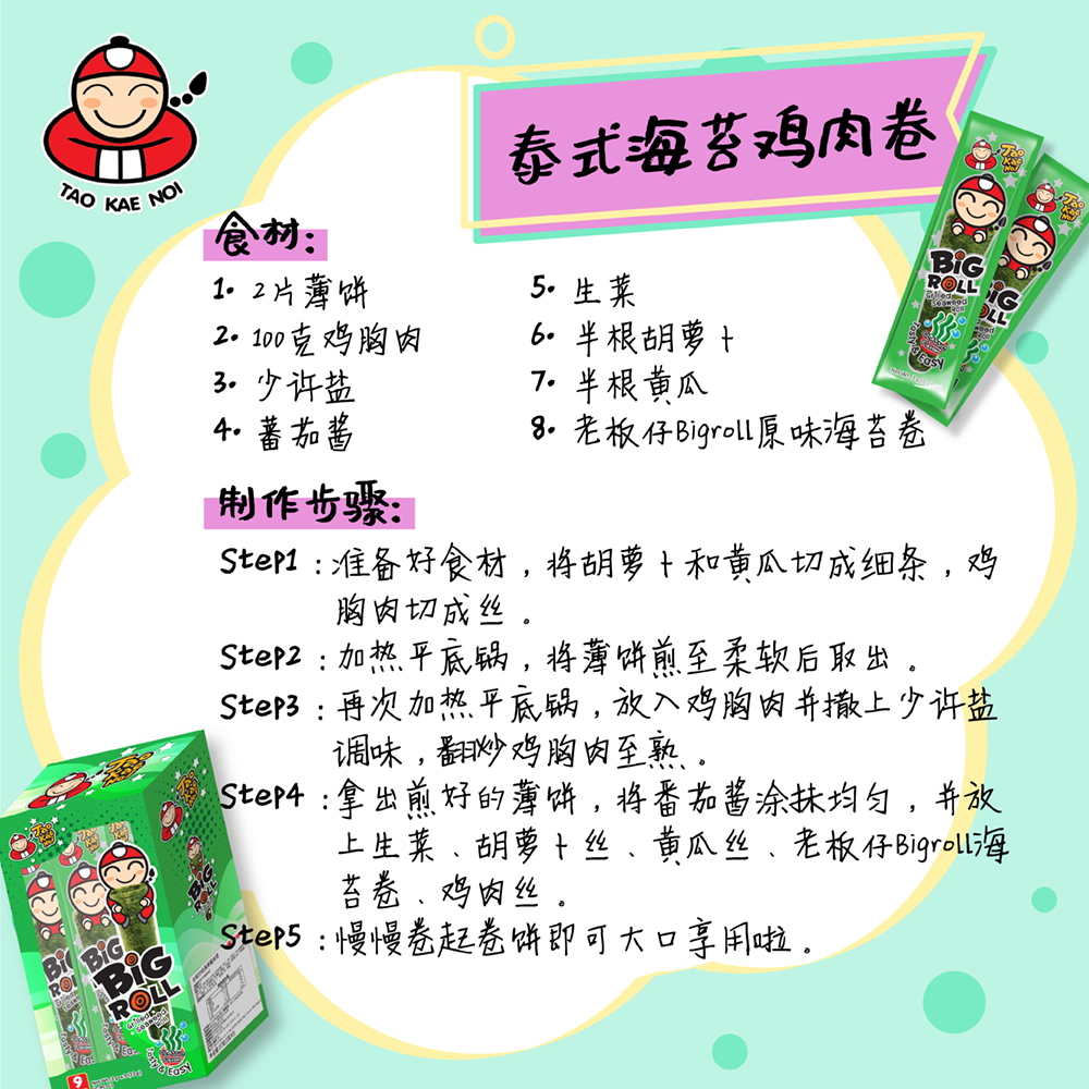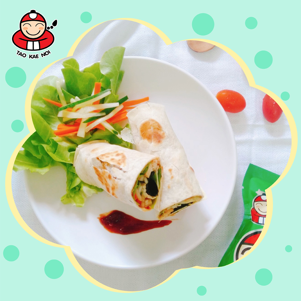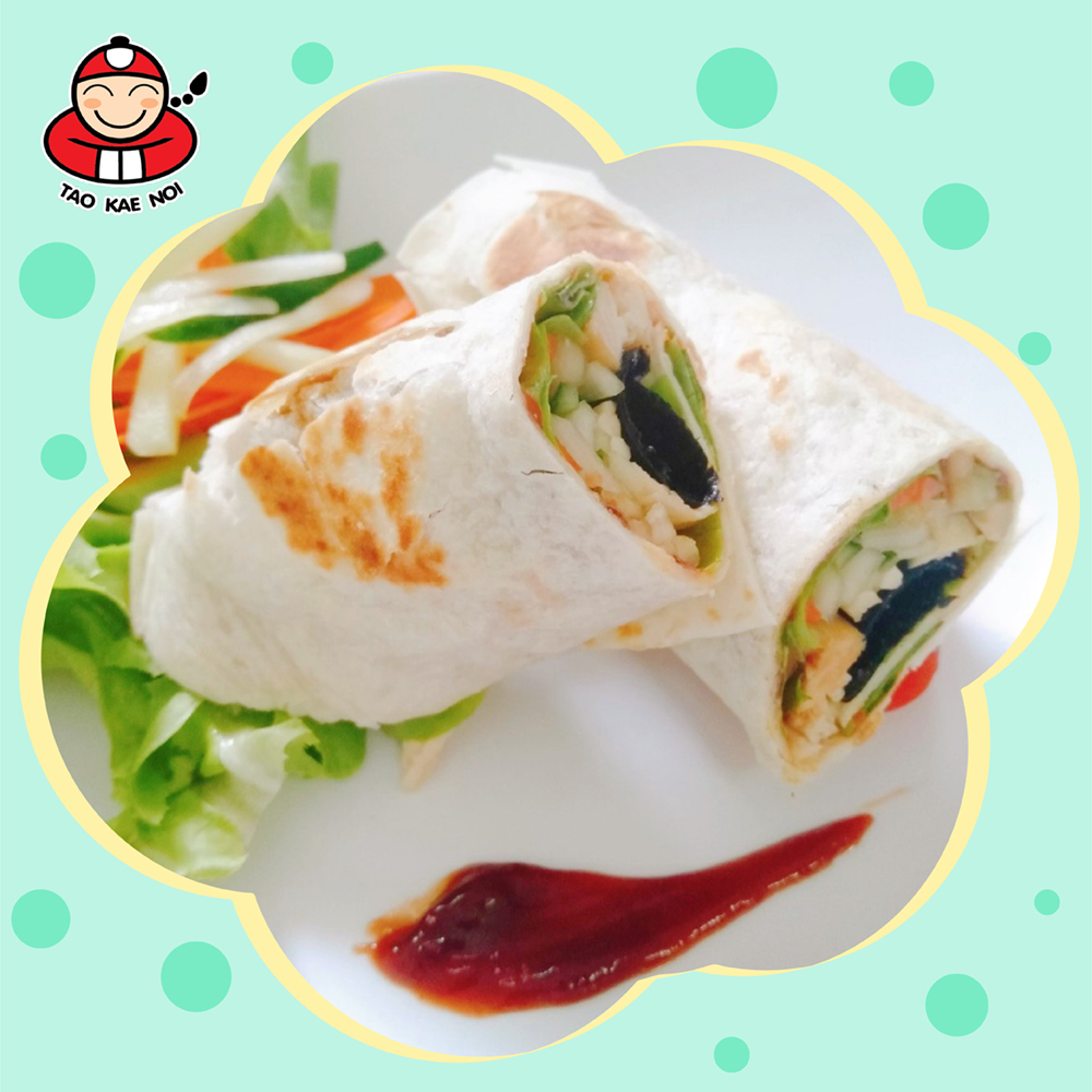 4 Siapkan tortilla yang sudah matang, oleskan saus tomat di seluruh bagian. Kemudian, masukan arugula/green oakleaf, wortel, mentimun, Taokaenoi big roll dan ayam diatas roti tortilla.