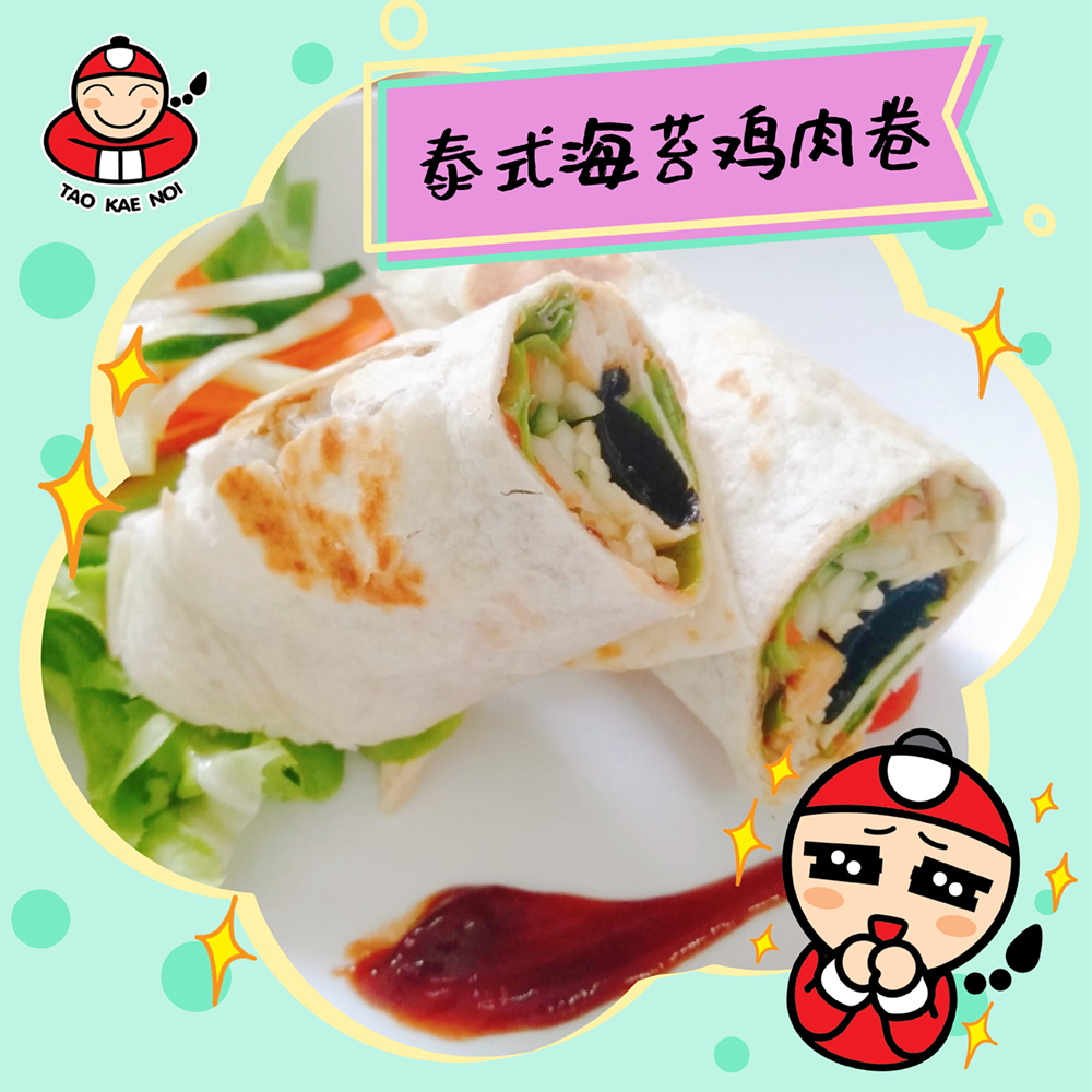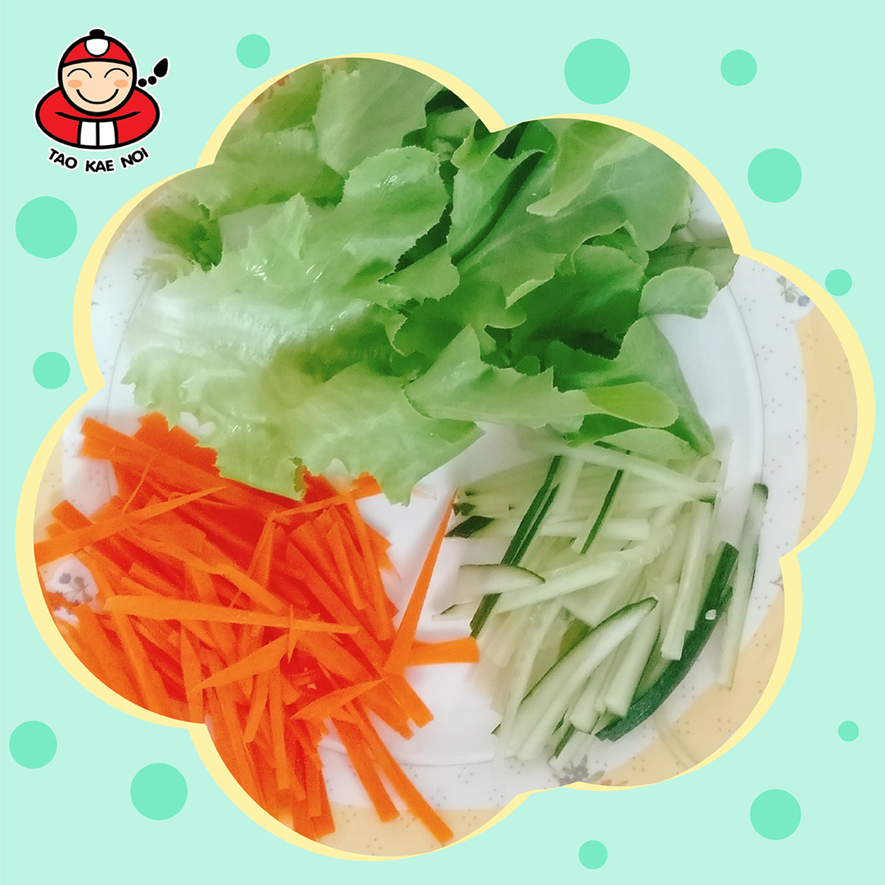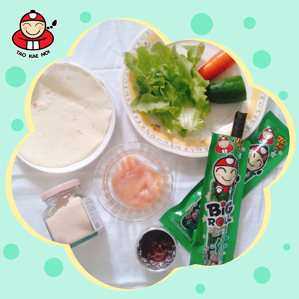 4. Prepare the cooked tortillas, apply the tomato sauce around the whole piece. Then, put the green oak, carrots, cucumbers, Taokaenoi big roll and chicken on the tortillas.
